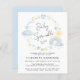 O convite feito por um bebê bebezinho, amigável em orçamento, é apresentado com cores de água azul pastel e amarela de um arco-íris, sol, corações, estrelas, luas e nuvens.