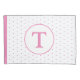 Design frente apresenta um fundo branco para pontos pocas cor-de-rosa. O centro exibe o inicial fornecido em rosa claro contra um fundo branco. A abertura é um rosa sólido. O reverso apresenta um fundo cor-de-rosa para pontos polka brancos. A abertura é um branco sólido. Projetado para coordenar com a "Coleção de Quartos das Raparigas Polka-Dot Rosa e Branca".
