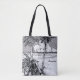 Uma bolsa de mão com letras personalizadas e arte tropical vintage de palmeiras em uma praia arenosa e belas nuvens sobre ondas calmas do oceano.