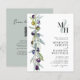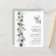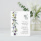 Símbolo de Ramo de Oliva do Orçamento do Monograma Convite de Casamento com Código QR RSVP no Verso... A frente do nosso convite para o casamento do monograma botânico barato apresenta as iniciais da noiva e do noivo sobrepostas em uma amostra pastel acima do texto de convite personalizado em serif negra e sans serif typografia em fundo branco. Ao lado do texto do convite à esquerda está um belo galho de oliveiras em tons de verde empoeirado, azul escuro e roxo. A parte verde suja do convite inclui o código QR do seu site de casamento, bem como o URL do site que permite aos seus convidados RSVP on-line facilmente e visualizar todos os detalhes normalmente enviados em um pacote de casamento. O exemplo de código QR e todo texto de exemplo (além do texto de ampersand e elementos de caligrafia) podem ser facilmente revisados com suas próprias informações sobre o modelo de personalização.