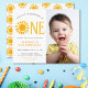 Convide a família e os amigos para a sua primeira festa de aniversário com este belo convite para o orçamento do primeiro aniversario. É decorado com um sol amarelado e diz "Nosso Pequeno Sol É Um". As costas estão decoradas com um padrão solar. Facilmente personalizável. Substitua a foto por uma de suas. Perfeito para a primeira festa de aniversário de um menino ou de uma menina. Original Watercolor © Michele Davies.