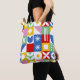 A colorful tote bag over their shoulder. The bag is the star of the scene — a bold patchwork-style design made up of bright geometric blocks, each featuring its own playful pattern.