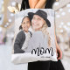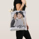 Simples Mãe Personalizada Tote Bag. Celebre a maternidade com este design minimalista com a palavra "mãe" em uma letra minúscula serif na parte inferior direita para uma aparência quente e divertida. Uma banda branca corre ao longo do fundo, onde o texto se sobrepõe entre o branco e a foto para um toque limpo e moderno. Você pode adicionar um "ano de festa" personalizado para torná-lo especial para uma futura mãe, ou para celebrar a mãe a qualquer momento. A design é impressa em ambos os lados e você pode incluir até 3 anos ou encurtá-la (como 23' 24' 25'). Perfeito para o Dia das Mães ou para o uso diário, este bolsa simples e eterno honra a mãe no estilo.