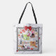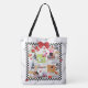 Grande saco de tote de poliéster todo-impressão com escovas, com uma imagem de adoráveis senhoras sentadas num café em Paris, desfrutando de um belo dia de abril num quadro preto e branco de pranchas de xadrez numa imagem lavada das Torres Eiffel pretas, a branco. Veja toda a coleção de Tote Bag de Cancan em TOUCHES ESPECIAIS | Seção Favoritos para festas.