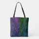Embrace a bold, dual-tone look with this striking "Grid Split" tote bag featuring a vertical split design—deep royal purple on one side and forest emerald green on the other—overlaid with an intricate web of luminous white geometric lines. A futuristic statement in your street-wear accessories collection.