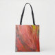 Rich reds dominate the surface, balanced by warm earth tones and flashes of green, creating depth and visual tension.