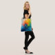 Tinta azul, verde e laranja se combinam para fazer um design abstrato bonito e colorido nesta bolsa de tote.