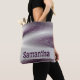 Você está procurando um bolsa de na moda para segurar todas as suas necessidades móveis? Esta bolsa de tote apresenta um padrão ousado e moderno em roxo e branco. As linhas diagonais brilhantes aparecem tanto na frente quanto na parte traseira deste saco de tote contemporâneo. Uma faixa roxa com luz sólida aparece na parte inferior e pode ser personalizada rápida e facilmente.