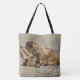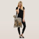 Um bebê adorável, descansando em uma bolsa de impressão tote maravilhosa.