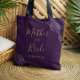 Esta linda bolsa tote moderna para Mãe da Noiva apresenta um design de ágata em aquarela roxa aparada com brilho dourado falso em dois cantos. As palavras "Mãe da Noiva" aparecem em escrita à mão dourada sobre um fundo roxo. Adicione o nome dela em fonte copperplate dourada.