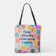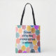Esta bolsa de tote tem uma design de círculos concêntricos com uma citação de Beyoncé celebrando mulheres.