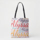 Alyssa. Mostre e vista este famoso e belo nome feminino desenhado como uma nuvem de palavras colorida feita de tipografia cursiva horizontal e vertical de letras de mão em diferentes tamanhos e cores frescas adoráveis. Vista seu nome americano positivo ou mostre o mundo que você ama ou ama. Merch com este trabalho de arte de texto suave é um presente de excelente, não apenas no mês de história das mulheres, ou presente de aniversário.