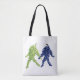Saco tote de Amigos Uva. Um par de cachos de uva, um verde e um roxo, caminham juntos de mãos dadas. O caule do cacho verde parece estar olhando para o cacho roxo. O caule da uva roxa devolve ansiosamente o olhar.