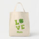 Um adorável bolsa de mercearia para a mãe, Este design apresenta o design gráfico "Amor" escrito com um trevo sortudo de quatro folhas. "Mãe" está escrita embaixo em uma bela fonte verde. Compre sua bolsa de tote de mercearia hoje! Gráfico criado por: Prettygrafik design (https://www.etsy.com/shop/Prettygrafikdesign)
