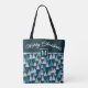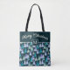 Esta bolsa festiva de tota de Natal apresenta um padrão repetitivo de na moda de árvores em tons fosco azuis, lacas e roxos macios, em um estilo aquarela. Um painel negro e ousado é o pano de fundo do "Feliz Natal" em um roteiro elegante, e o saco também apresenta sua inicial personalizada dentro de um 'quadro' de borda quadrada. Versátil para comprar férias, sazonal, carregando de inverno ou como saco de apresentação, essa design moderna combina um florescimento festivo com um toque personalizado.