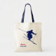Qualquer um que adora esquiar ou tirar férias em Aspen, Colorado, vai gostar desta bolsa. Ele apresenta um esquiador de neve azul-silhueta com traços de neve branca ao seu redor. Na parte inferior está o texto personalizado em vermelho e azul que você pode facilmente. *O Clip art usado neste design é protegido por direitos autorais pela Encore Software, Inc., que permite o uso a seus licenciadores. Todos os direitos reservados.
