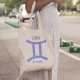 Este saco de tote Gemini roxo e lavanda bonito apresenta seu sinal astrológico do Zodiac em um belo brilho como as constelações. Personalize este belo presente de símbolo astrologia com seu nome em script cursivo para alguém com aniversário de final de maio ou início de junho.