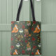 Raposa vermelha, coelho, coruja, mariposa-luna, marten-pinheiros, com folhas de outono, abóbora, flores e bolotas num pano de fundo verde profundo