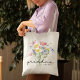 Esta elegante bolsa de tote apresenta uma vibrante buquê de aquarela de flores silvestres, incluindo flores rosa, amarelas e roxas, complementadas por um verde delicado. Borboletas encantadoras e libélulas acrescentam um toque caprichoso. A palavra "vovó" é lindamente escrita à mão em um roteiro preto, em conjunto com um ano personalizável para torná-la única dela.