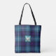 Moderna, elegante e feminina bolsa personalizável apresenta "nome personalizado e monograma" em um crachá de couro e fundo xadrez escocês azul celadônia / azul escuro.