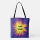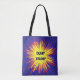Esta bolsa de tote apresenta um padrão político de abstrato de starburst em vermelho, amarelo e azul com as palavras Dump Trump no centro. O texto pode ser personalizado.