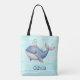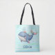 Esta bolsa personalizada apresenta uma baleia branca e engraçada num vibrante esquema de cor rosa e azul nadando brincando com um pequeno chapéu.