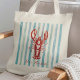 Esta bolsa de tote inspirada na costa tem uma vibração estética dos pescadores, com lagosta vermelha de Maine sobre fundo de listras de azul aqua e de lacas, com texto personalizável. Este saco de tartes de pescadores é perfeito para um dia na praia, ou para adicionar uma vibração pré-definida inspirada no oceano náutico à sua vida quotidiana.