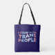 Mostre seu apoio à comunidade trans com este saco de totas de marinho com as palavras "I Stand with Trans Pessoas" nas cores do indicador trans.