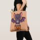 O colecionador de doces mais bonito. Esta bolsa de tote é perfeita para pequenos monstros e adultos, apresentando um morcego amigável e uma pilha de abóbora sorridente. Esta design é uma maneira deliciosa de carregar das suas guloseimas e essenciais durante toda a temporada.