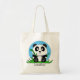 Urso panda branco e preto, segurando um tiro verde de bambu. Ele está sentado sobre uma grama verde com fundo azul. Abaixo do panda está uma modelo em cinza para adicionar seu nome para personalizar esta ilustração.