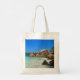 Um saco de tote com uma fotografia de uma praia azul-oceânica turquesa com rochas grandes espalhadas ao longo da costa. Local tropical brilhante e ensolarado.