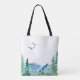 Esta bolsa de boas-vindas ao casamento do Colorado é perfeita para um casamento de destino de montanha. O design apresenta uma paisagem de natureza selvagem pintada, azul e verde, com pinheiros de aquarela, pássaros e montanhas. Personalize a bolsa com a localização do seu casamento, os nomes da noiva e do noivo e a data do casamento.