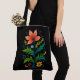 Carry your everyday essentials in bold, breathtaking style with this premium dark cottagecore all-over-print tote bag. Thanks to a specialized "printed then sewn" manufacturing process, this stunning illustration of a symmetrical folk art floral tree covers the exterior flawlessly from edge to edge. The vibrant orange main bloom, alongside lush green and blue foliage, creates a magnificent contrast against the deep, dramatic black canvas-textured background. This rich color palette perfectly balances rustic, handcrafted charm with modern, moody elegance.