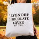 Personalized chocolate lover tote bag featuring your name and special year. A clean, elegant typography design perfect for true chocolate lovers. Makes a thoughtful personalized gift for women who love sweet treats and minimalist style.