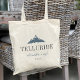 Bem-vindos convidados ao seu casamento de destino vitorioso com estes sacos de tote personalizados e quentes. Design apresenta uma ilustração dos picos da montanha de neve em azul com seu destino de casamento embaixo (mostrado com Telluride, Colorado) em letra serif clássica. Adicione seus nomes em um script cursivo manuscrito, assim como no ano. As cores podem ser alteradas para combinar com as cores do seu casamento usando a ferramenta de design do Zazzle.