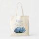 Saco de boas-vindas de casamento das flores da hydrangea azul para um casamento de destino. Personalize o script azul com seus nomes, local do evento e data. Dar aos convidados como obrigado para ir ao casamento.