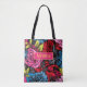 Um padrão maximalista ousado com flores vermelhas, rosa e azuis brilhantes, folhas verdes elétricas e sotaques de gótico.