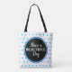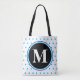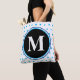 Diversão de bolinhas azuis brilhantes e reversíveis sobre fundo branco. Personalize com o seu monograma inicial em dentro de texto branco do círculo preto. O fundo do saco tem a redação, Tenha um belo dia. Deixe o texto, insira o seu próprio ou exclua para mostrar apenas design de padrão de imagem em círculo grande. Moda geométrica da mochila das mulheres para qualquer estação. Designs originais © TamiraZDesign. www.zazzle.com/tamirazdesigns