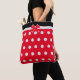 Bolinhas prateadas elegantes com fita vermelha sobre fundo vermelho com o cabeçalho preto Tote bag.
