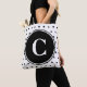Padrão reversível chic com bolinhas pretas sobre fundo branco. A frente do saco tem um grande círculo preto esboçado em branco. Personalize com o seu monograma inicial em texto branco. Bolsa geométrica moderna de moda feminina para verão ou qualquer estação. Designs originais © TamiraZDesign. www.zazzle.com/tamirazdesigns