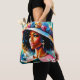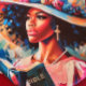 Linda senhora afro-americana com sua Bíblia pronta para estudar Bíblias. O trabalho de arte do saco de tota é uma mistura de tinta acrílica e óleo criados num comprimido digital. Ela tem um lindo chapéu com rosas florais multicoloridos.