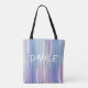 Este saco de tote de listras azuis bonito tem texto em um desenho abstrato de traçado de tinta. Direitos autorais originais do design Ann Powell.