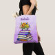 Saco personalizado. Gráficos de uma ilustração aquosa de uma pilha de livros bonito de safra azul cobertos de flores laranja e amarelas com fundo roxo, feitos no estilo ai watercolor.