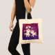 Um saco de tote personalizado com 2 unicórnios dançantes bonitos com caudas brilhantes e coloridas, e mano. Um arco-íris colorido com nuvens em cada lado acima de suas cabeças. Outros elementos incluem uma pequena flor, um coração e algumas estrelas. O plano de fundo é uma imagem com falso brilho em roxo brilhante e rosa.