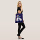 Um saco de tote com 2 unicórnios dançantes bonitos com caudas brilhantes e coloridas, e mano. Um arco-íris colorido com nuvens em cada lado acima de suas cabeças. Outros elementos incluem uma pequena flor, um coração e algumas estrelas. Fundo roxo escuro.