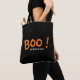 Boo! Saco de Tote do Nome Personalizado Moderno do Halloween, design apresenta "Boo" em laranja. Personalize o monograma personalizado com um nome individual ou nome de família.