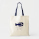 Saco de tota de lagosta azul marinho com texto personalizado. Use como saco de boas-vindas para um casamento de destino, ou dê aos membros da festa de casamento e/ou aos membros da família. Imagem de lagosta azul escura com três linhas de texto impresso à mão abaixo. Incluir nomes da noiva e noiva, data e local da celebração. Barato e favor útil do casamento, com um simples, mas eficaz, design para qualquer casal planejando um casamento baseado no mar. O bolsa de orçamento tem cores de identificador opcionais.