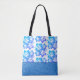 Esta sacola é mostrada com um design tropical bonito do impressão das flores no cores azuis/roxas em uma cor branca do fundo com tira colorida do acento do falso brilho azul na parte inferior.