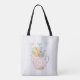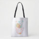 Um saco de tote com uma ilustração química. Um bule cor-de-rosa com um pequeno coração e dentro de flores. Delicar borboletas coloridas com sabor a flecha. Colocado sobre uma cinza e fundo listrado branco.
