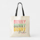 Bunny Babe Cute Modern Girly Páscoa Personalizada Tote Bags apresenta o texto moderno "Bunny Bunny Bunny Babe" em rosa, turquesa e tipografia amarela e personaliza com seu nome editando o texto na caixa de texto fornecida. Elaborado por ©Evco Holidays www.zazzle.com/store/evcoholidays